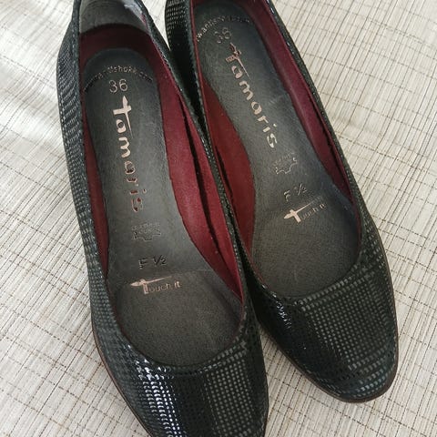 Tamaris korkokengät koko 36, mustaa nahkaa. Kengissä on karvareunus ja kapea kärki. Korko on matala ja kenkien pohjat ovat kuvioidut liukkauden estämiseksi. Sivussa vetoketjut.
