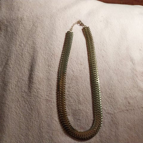 Hopean värinen kaulakoru. Ruostumatonta terästä. Myytävänä myös muualla.