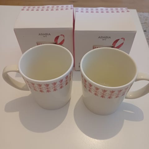 Arabia Kielo muki, tilavuus 0,3 litraa. Valkoinen posliinimuki, jossa vaaleanpunainen kielokuvio. Soveltuu astianpesukoneeseen, mikroaaltouuniin ja uuninkestävä. 2 kpl myynnissä, hinta 15 e/muki. Mukit ovat uusia. Syöpäsäätiön Roosa-nauha mukeja. Kuvion suunnittelija Raija Uosikkinen.
