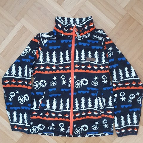 Lasten oleskelu ym, haalari, koko 128, väriltään musta ja valkoinen. Pojille suunniteltu vaate, jossa pitkä vetoketju ja kuviolliset hihat.