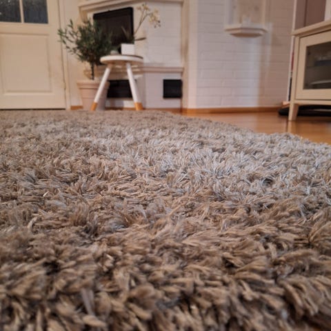 Upea, kiiltävä nukkainen oranssin-punainen matto. Nukan korkeus 3 cm. Eri valaistuksessa värisävyt vaihtelevat kiiltävän nukan takia. Painava matto.
