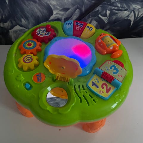 Fisher-Price Aktiviteettipöytä vauvoille, jossa on valkoinen ja pinkki väri. Pöytä sisältää erilaisia leluja ja aktiviteetteja, kuten pyöriviä osia, palikoita ja hammasrattaita. Sopii pienten lasten motoristen taitojen harjoitteluun ja leikkiin. Palikoita tiputtessa kuuluu hauskoja ääniä ja valoja. Irtonaiset palikat hävinneet mutta toimii esim dubloilla/ pikkuautoilla jne. Huomioitu hinnassa. Tukeva.
