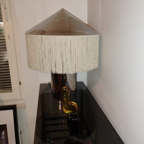 Kaunis italialainen pöytävalaisin. Runko kromattua ja kullattua terästä. Valaisimen katkaisin lampunkannassa. Lamppu E27 kannalla. Reilun kokoinen halkaisija 40 cm ja korkeus 66 cm.