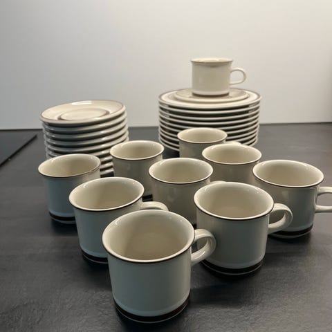 Arabia Hilkka kahvikupit ja lautaset, yhteensä 12 kappaletta. Sarja on harmaata posliinia, jossa on ruskeat reunukset.