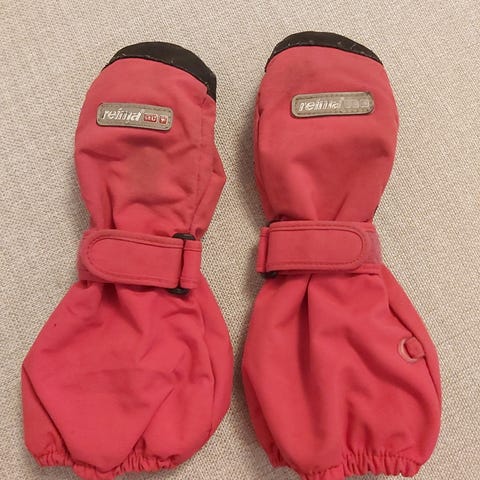 Paljon käytetyt hanskat, vasemman käden rukkasessa pieni parsittava reikä. Käytetty meillä 1-4-vuotiaalla.