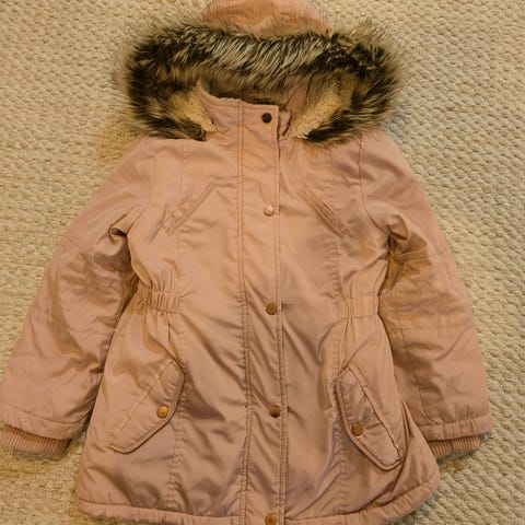Lasten vaaleanruskea talvitakki, koko 122, suunniteltu tytöille. Materiaalina pehmeä kangas, jossa valkoiset koristeompeleet ja vuorattu sisäpuoli valkoisella karvalla. Takki sisältää vetoketjun ja hupun. Sopii viileisiin säihin.