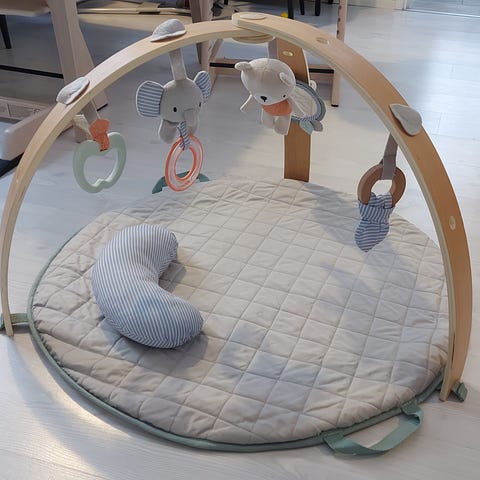 Itse leikkimatto ja puukaaret on ehyet, vaikka leluista osa on kärsinyt enemmän, osa vähemmän. Yksi lelu on hukassa, mutta saattaa löytyä vielä. Vaikka tähänhän voi laittaa mitä tahansa leluja roikkumaan. Mukaan saa halutessaan tuon masuaika tyynyn, mutta siinä on reikä ja vaatisi paikkauksen.