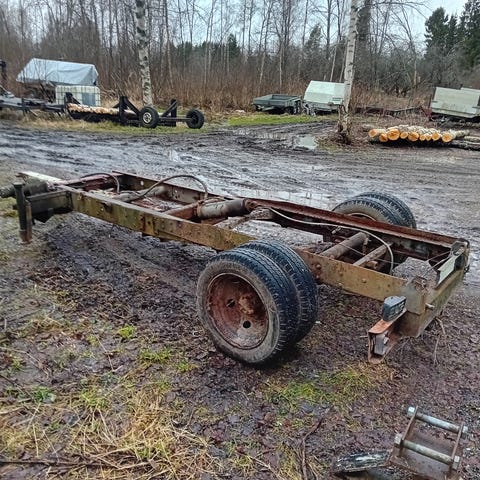 Akseli jousitettu ja laidat avattavat, rautainen tukijalka. Ei lahoa, säilytetty katoksessa. Hyvä työkorkeus puuhommiin.