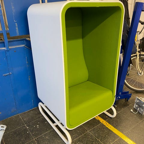 Hyväkuntoinen Box Lounger tarjolla kotiin tai toimistolle. Tuolin sisäosa on vuorattu ääntä eristävällä materiaalilla, joten boksin sisällä voi vaikka höpöttää puhelimessa, leikkiä läppärillä, tai jopa vetää lonkkaa. Muotonsa ja ulkonäkönsä puolesta tuoli sopii hyvin myös tilan jakamiseen. Lounger seisoo neljällä jalalla, jotka on vielä vahvistettu teräskehikolla. Korkeus 150 cm, leveys 79 cm ja syvyys 73 cm.