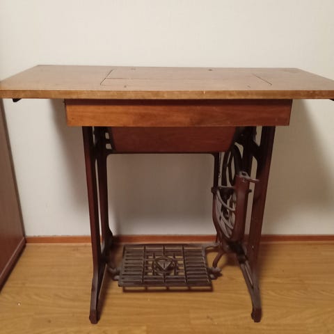 Pöydän alla muutama vuosi sitten toimivaksi todettu ompelukone.