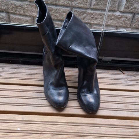Filippa K korkonilkkurit, koko 39, mustaa nahkaa. Nilkkapituiset saappaat, joissa on vetoketju takaosassa. Koron korkeus noin 5 cm (arvio). Mukavat jalassa. Huolletut ja siistissä näköiset, mutta käytön jälkiä voi olla erityisesti sisäpuolella.