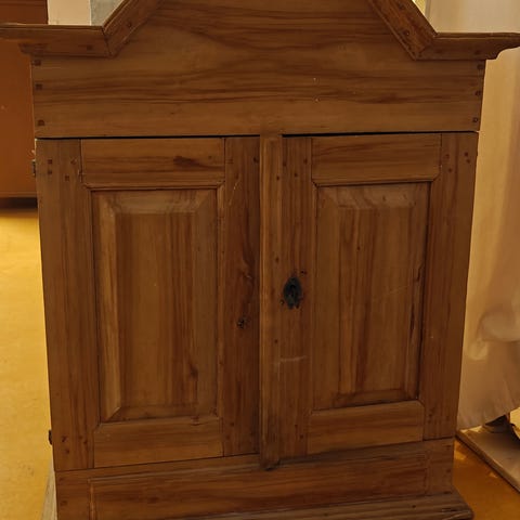 1800-luvun puinen renginkaappi myytävänä. Kaappia paikka paikoin kunnostettu ajan saatossa ja uudelleen liimattu. Vanhaa madon reikää siellä täällä. Ei hajuja. Taustassa reikä. Yhdellä koukulla, joka sijaitsee kannen päällä. Avain tallessa ja lukitus toimii.