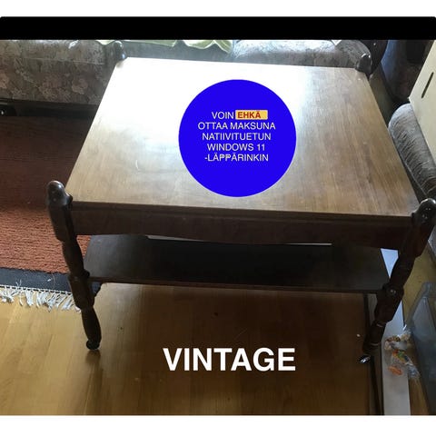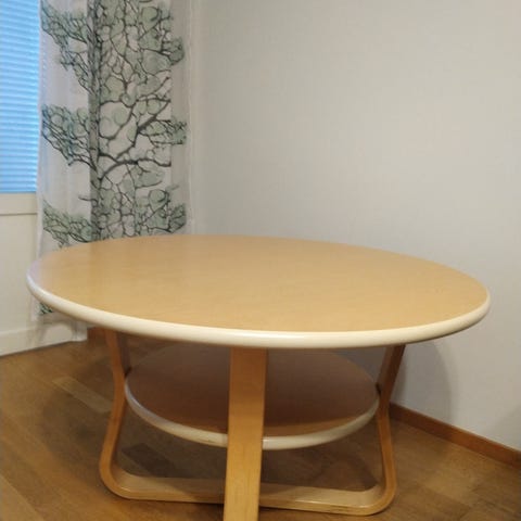 Täyttä puuta oleva olohuoneen pöytä. Käytön jälkeä näkyvissä mutta kokonaiskunto hyvä