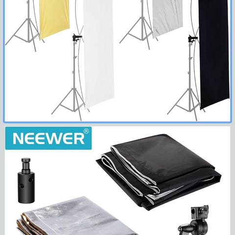 rcs Valonheijastin 5-in-1, koko 80 x 120 cm, värit hopea ja kulta. Valonheijastimessa on useita heijastuspintoja, joita voidaan vaihtaa tarpeen mukaan valokuvauksessa tai videokuvauksessa. Materiaali on kevyt ja taitettava, mukana kantopussi.