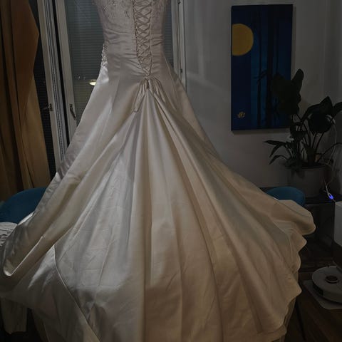 Puku on noin kokoa 36-38, tarkempi istuvuus selviää sovittamalla. Koon 34 morsiamellekin tämä voisi kenties sopia pienellä korjausompelulla. Puku on käytön jälkeen pesetetty kemiaallisella pesulla ammattipesulassa.