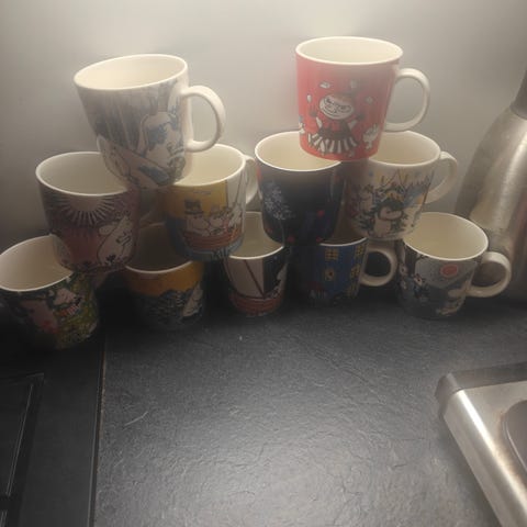 Arabia Muumi Mukiastiat, 24 erilaista mukia. Säilytetty vitriinissä osa uusia ja tarrallisia. Otetaan vastaan myös järkeviä tarjouksia.