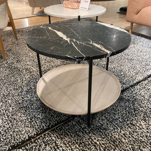 Uudet pöydät valmistajan pakkauksessa. Materiaali lakattu tammiviilu, jalat valkoiseksi maalattu metalli. Pienemmän pöydän halkaisija 50 ja korkeus noin 37cm. Pöydät mahtuvat sisäkkäin, mutta niitä voi käyttää myös erikseen. Suositushinta 433eur.