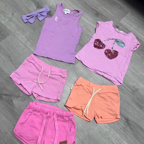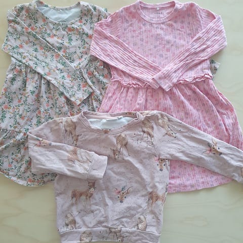 1x Name It college, 2x Name It pitkähihaiset paidat, 1x Name It lyhythihainen paita, 1x Gugguun lyhyet housut, 1x Metsola housut, 1x Name It mekko