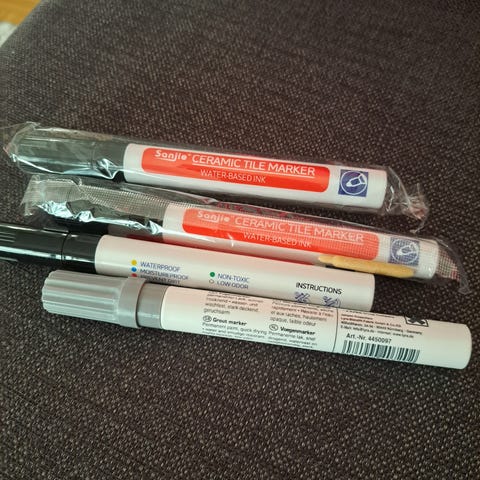 Tarpeettomana 3 mustaa ja 1 harmaa tussit kaakelien saumojen vahvistukseen