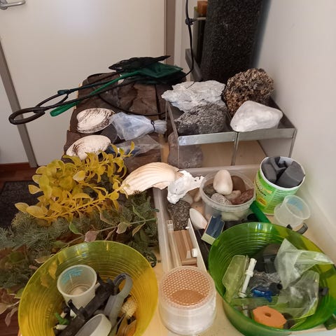 Kaikki kerralla. On mm. tekokasveja, kivi, erilaisia koristeita, lämmitin ja ilmapumppu. Akvaario myyty muutama vuosi sitten ja silloin kaikki ollut käytössä ja toimivia. Nyt ei toimivuudesta 100% takuuta.