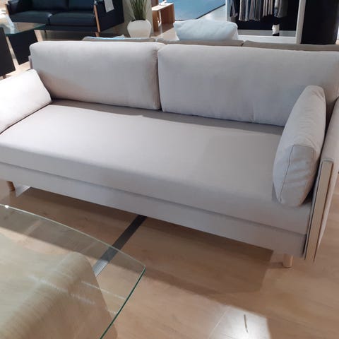 Erittäin hyväkuntoinen mallikappale edullisesti. Vuodekoko levitettynä 160*200cm tai 2x 80*200cm. Vuodepinnat ja tyynyt irtoverhoiltu. Ridge 06 tummanharmaa. Jalat ja puu-yksityiskohdat saippuavahattu tammi. Käsinojatynyjen sisällä vanutäytteiset sijauspatjat 80*200cm. Suositushinta 2699eur.