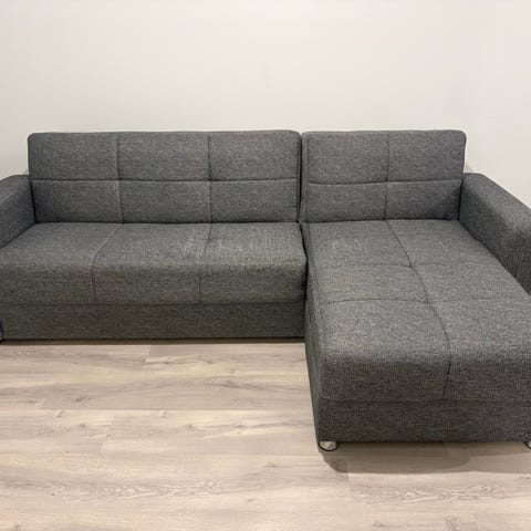 Myydään siisti ja hyväkuntoinen harmaa kulmasohva, joka muuntuu helposti vuoteeksi.
