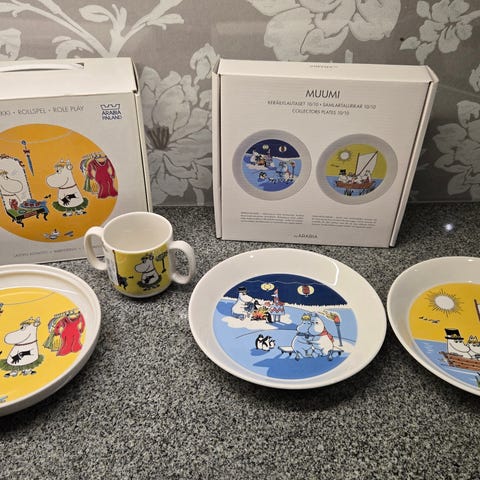 Virolaisen keramiikkataiteilijan Helina Tilkin käsin maalaamat lastenastiat: tipumuki ja -lautanen + virtahepomuki ja -lautanen. Erittäin hyvässä kunnossa. Lapsia ilahduttavat kauniit astiat uuteen kotiin!!
