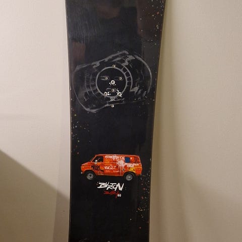 Hyväkuntoinen, vähän laskettu Burtonin Bullet lauta Burtonin Freestyle FS-siteillä.