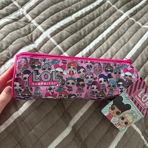 L.O.L. Surprise penaali, jossa pinkki liila väri ja kuvioitu ulkopinta. Sopii kynien ja pienten tarvikkeiden säilytykseen. Materiaali ei määritelty, lapsille suunnattu tuote.