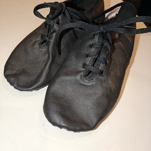 Mustat tanssitossut, ehjät mutta kuluneet. Kokomerkintä kulunut pois arviolta kokoa 33-34.