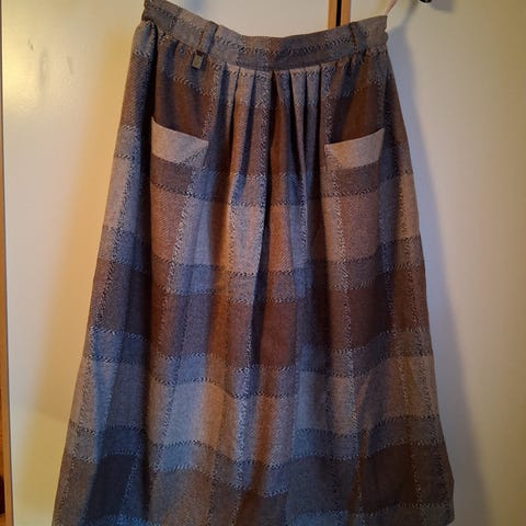 Hyvänkuntoinen ruutu villahame. Vyötärö 37 cm, pituus 61 cm. Paksua kangasta, vintage malli.