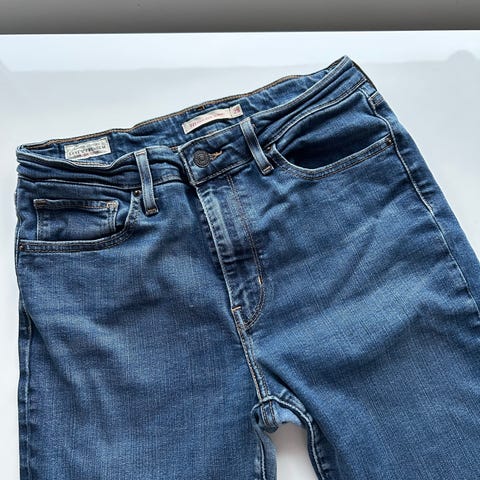 Levi's 724 High Rise Straight farkut naisten koko, vyötärönympärys W29. Farkut ovat sinisen väriset ja suoralahkeiset, valmistettu denim-materiaalista, joustaa. Vy 78cm, haara-lahje 73cm
