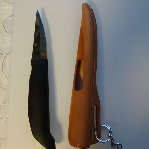 Puukko, jossa puukahva ja nahkatuppi. Veitsen terä on metallia. Sopii erilaisiin käyttötarkoituksiin, kuten retkeilyyn ja askarteluun.