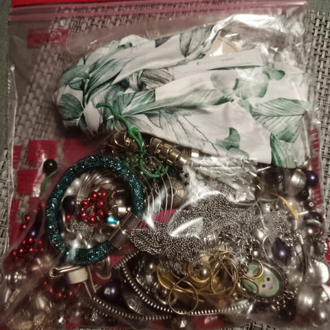 Pieni peltinen kirstu ja kasa kaikenlaisia koruja .