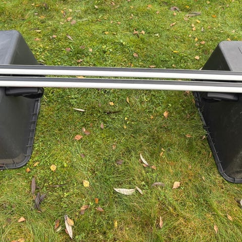 Thulen Slidebar kattoteline 127 cm jonka voi vetää sivulle kummallekin puolelle ja täten helpottaa lastausta kun boksi on reilusti ohi auton kyljen. Thulen jalusta nyt C kiskoon menevä malli jalkoja voi muuttaa autokohtaisesti.