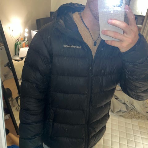 Peak Performance Talvitakki mustassa värissä, koko M. Takki on suunniteltu ulkokäyttöön kylmillä säillä. Siinä on irrotettava huppu, joka on reunustettu tekoturkiksella. Sisävuori on pehmeä ja lämpöä eristävä. Takissa on useita taskuja sekä vetoketju- ja napituskäsittely etuosassa. (Yksi etuosan nappi halki)