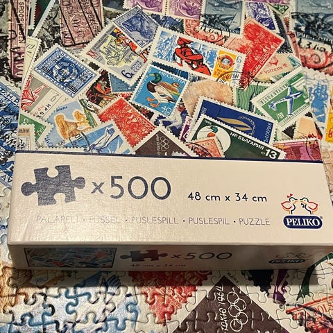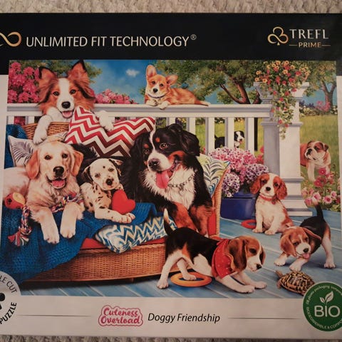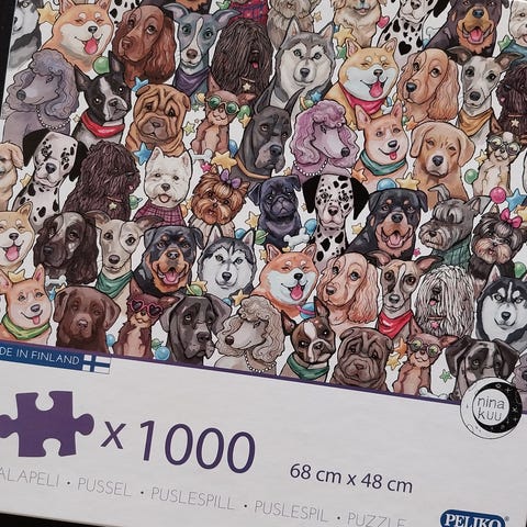 Peliko 1000 palan palapeli, jossa on koirakuvio. Palapelin koko on 68x48 cm. Palat tallessa.