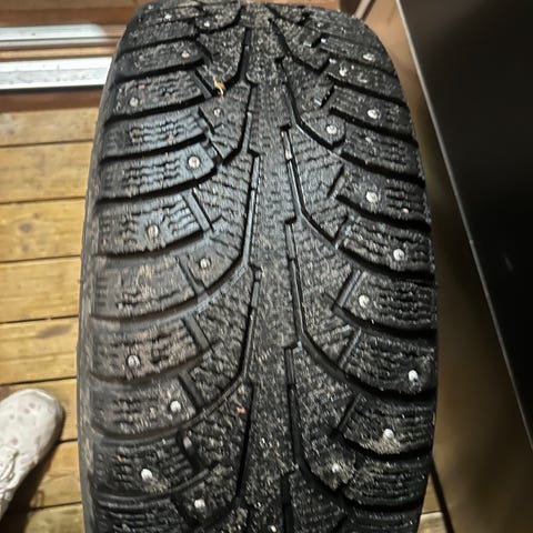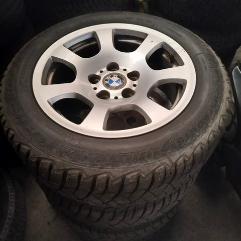 BMW nastarenkaat vanteilla, koko 16 tuumaa. Renkaat soveltuvat talvikäyttöön ja sisältävät nastat parantamaan pitoa lumella ja jäällä. Renkaiden kunto näkyy kuvissa, ne on tarkoitettu henkilöautoon.