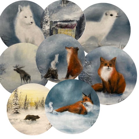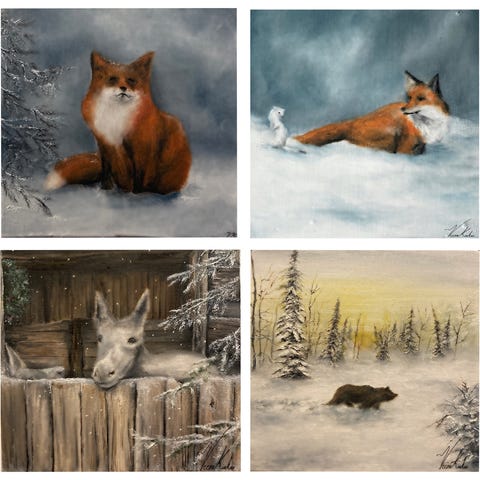 Öljyväreillä maalatuista talvisista tauluista valokuvapaperille printattuja kortteja!!