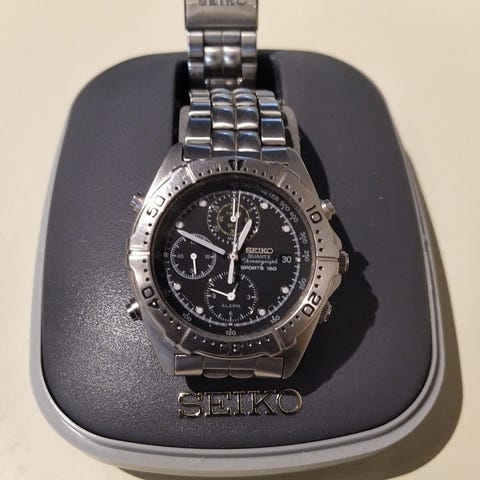 Myydän uuden käyttökellon tieltä seiko sport 100 chronograph. Kello on hyvässä kunnossa ja toimii niinkuin pitää. Käytön jälkiä on jonkinverran enimmäkseen rannekkeessa.