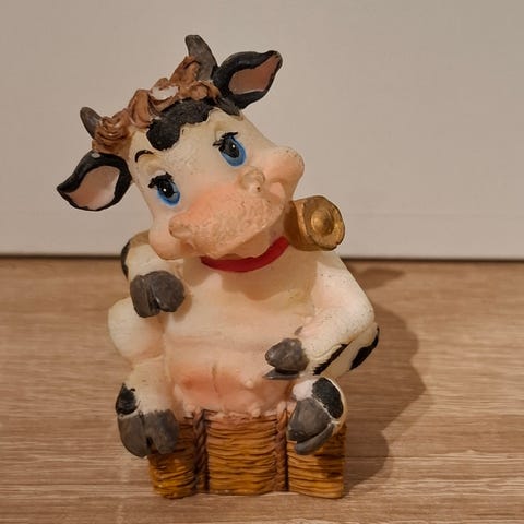 Myydään musta valkoisen lehmä aiheinen patsas.itsellä olnut koristeena hyllyllä