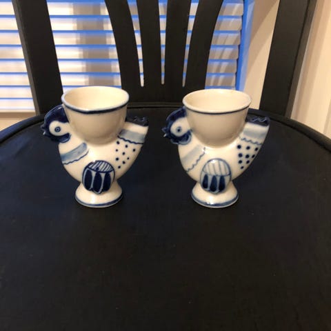 Virheettömät, vitriinistä, käyttämättömät. Korkeus noin 7 cm, lautasen läpimitta 10,5 cm.