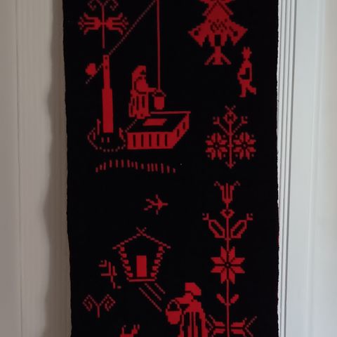 Vihreän ja keltaisen sävyjä, hivenen tummaa ruskeaa. On näyttävän näköinen isolle seinälle. Mukana tangot ylhäällä ja alhaalla. Metallitanko ja puutanko. Ei hapsuja.