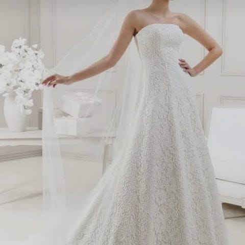 Myydään valkoinen applikaatioilla kirjailtu häämekko, jossa tyllikerroksilla luotu volyymiä helmaan, joten vannehameelle ei tarvetta. Yläosa luilla tuettu ja takana nyöritys, joka mahdollistaa mekon koko muutokset.