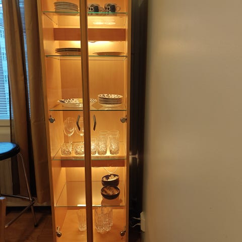 kotimainen kirjahylly 80-luvulta valaisimilla