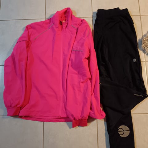 Vadelmanpunainen takki ja mustat housut (ei henkseleitä). Koko 34. Siistissä kunnossa, vähän käytetty.