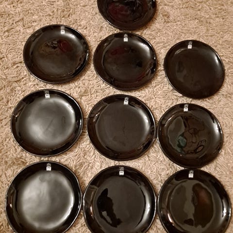 Riihimäen Lasin valmistamat ja Erkkitapio Siiroisen 1970-luvulla suunnittelemat Sesi-sarjan mustat pullalautaset. Lautaset on valmistettu muottiin puoliautomaatilla kiinnipuhalletusta värillisestä (mustasta) lasista. Lautasia on yhteensä 12 kpl 2:ssa alkuperäislaatikossa. Halkaisija 16 cm.