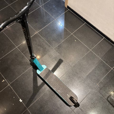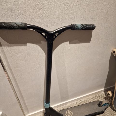 Finnscooterin valmistama / kokoama. Sopii hyvin pidemmälllekin harrastajalle. Tangonkorkeus 100 cm. Uutena ovh lähemmäs 400 euroa. Skuutti / potkupyörä, musta runko, siniset renkaat. Potkupyörä on suunniteltu temppuiluun ja vapaa-ajan käyttöön. Rungossa näkyy koristeelliset kuvioinnit. Sopii eri-ikäisille käyttäjille, jotka etsivät kestävää ja kevyttä potkupyörää.