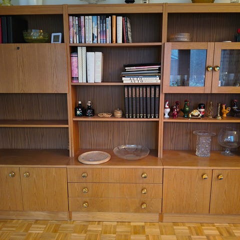 (7 erillistä modulia). Valmistettu puusta! Lipastossa on neljä vetolaatikkoa, joissa metalliset vetimet. Vitriinikaapissa on kaksi lasiovellista osastoa ja kaksi alakaappia, joissa on pystysuorat uritetut ovet ja metalliset vetimet.