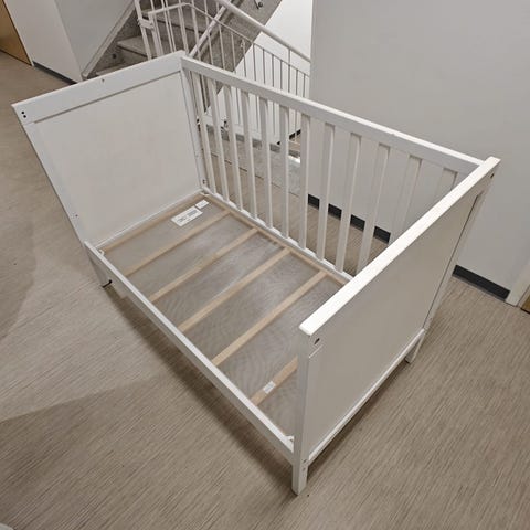 Sänkyyn sopivan patjan saa mukaan halutessaan, suojus on hieman kulahtanut mutta pestävissä.